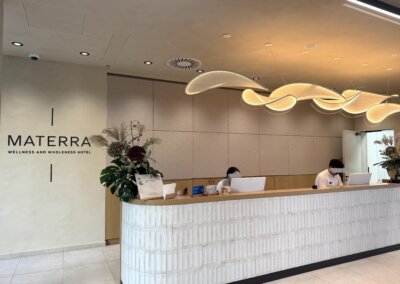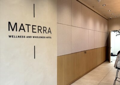 We meticulously treated the main lobby, including the wall behind the reception desk and two adjoining passageways, ensuring every detail – from panel color to placement – was thoughtfully tailored to the hotel’s sophisticated, open, and transparent architecture. This design allows the acoustic panels to be admired from both inside and outside the hotel, and we at Košćak Audio are immensely proud of this accomplishment.
